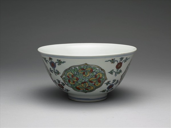 侈口,深壁,矮圈足。碗心彩畫折枝石榴,加飾青雙圈,周壁純白無紋飾。外壁彩畫四菱花形,中飾折枝挑實,間飾番蓮花。口足各飾青線兩道。底青花楷書「大明萬曆年製」,外加雙圓圈。