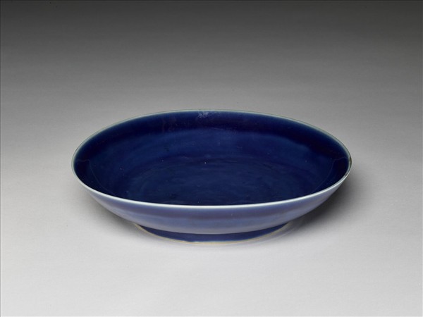 侈口窄唇,淺弧形壁,矮圈足。全器施霽青釉,施釉至足邊,口沿與足邊各留一道白邊,足緣無釉露白胎。足內壁及底施白釉,底有「大明萬曆年製」六字二行楷體暗款,外加雙圈。