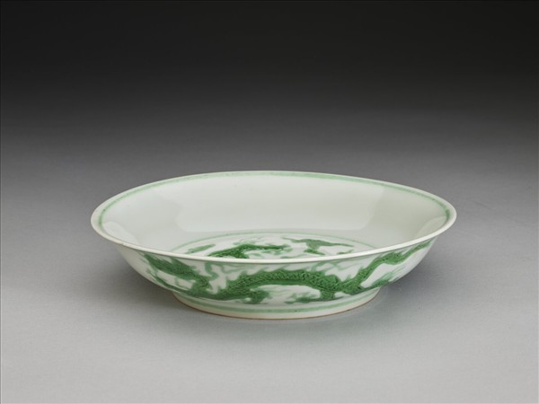 侈口,淺壁弧形,矮圈足。盤心與外壁刻畫雲龍三條,外壁隙地淺劃雙珠、波濤紋。薄胎白釉,龍紋加填綠彩,口足內外分畫綠線四道。底有青花書「大明正德年製」二行六字楷款,外加雙圈。