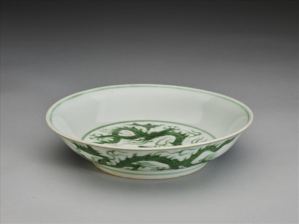 侈口,淺壁弧形,矮圈足。盤心與外壁刻畫雲龍三條,外壁隙地淺劃雙珠、波濤紋。薄胎白釉,龍紋加填綠彩,口足內外分畫綠線四道。底有青花書「大明正德年製」二行六字楷款,外加雙圈。