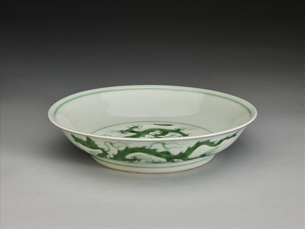 侈口,淺壁弧形,矮圈足。盤心與外壁刻畫雲龍三條,外壁隙地淺劃雙珠、波濤紋。薄胎白釉,龍紋加填綠彩,口足內外分畫綠線四道。底有青花書「大明正德年製」二行六字楷款,外加雙圈。