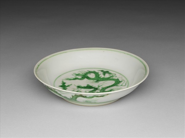 侈口,淺壁弧形,矮圈足。盤心與外壁刻畫雲龍三條,外壁隙地淺劃雙珠、波濤紋。薄胎白釉,龍紋加填綠彩,口足內外分畫綠線四道。底有青花書「大明正德年製」二行六字楷款,外加雙圈。