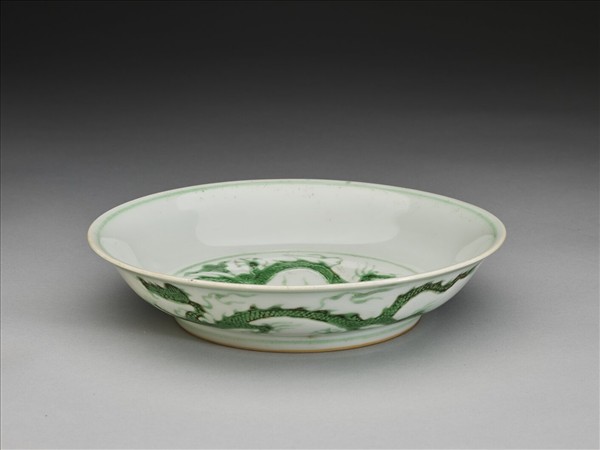 侈口,淺壁弧形,矮圈足。盤心與外壁刻畫雲龍三條,外壁隙地淺劃雙珠、波濤紋。薄胎白釉,龍紋加填綠彩,口足內外分畫綠線四道。底有青花書「大明正德年製」二行六字楷款,外加雙圈。