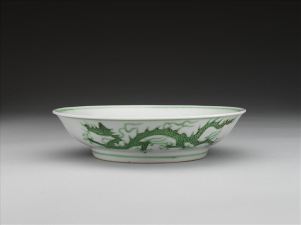 侈口,淺壁弧形,矮圈足。盤心與外壁刻畫雲龍三條,外壁隙地淺劃雙珠、波濤紋。薄胎白釉,龍紋加填綠彩,口足內外分畫綠線四道。底有青花書「大明正德年製」二行六字楷款,外加雙圈。