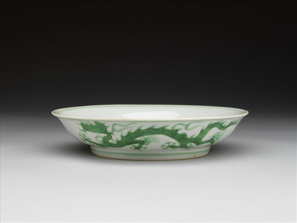 侈口,淺壁弧形,矮圈足。盤心與外壁刻畫雲龍三條,外壁隙地淺劃雙珠、波濤紋。薄胎白釉,龍紋加填綠彩,口足內外分畫綠線四道。底有青花書「大明正德年製」二行六字楷款,外加雙圈。