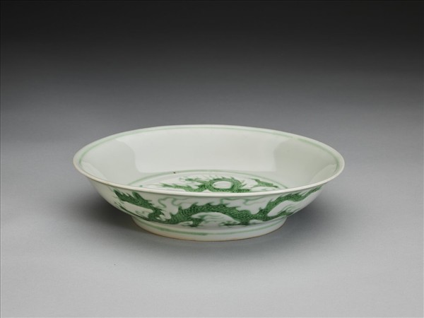 侈口,淺壁弧形,矮圈足。盤心與外壁刻畫雲龍三條,外壁隙地淺劃雙珠、波濤紋。薄胎白釉,龍紋加填綠彩,口足內外分畫綠線四道。底有青花書「大明正德年製」二行六字楷款,外加雙圈。