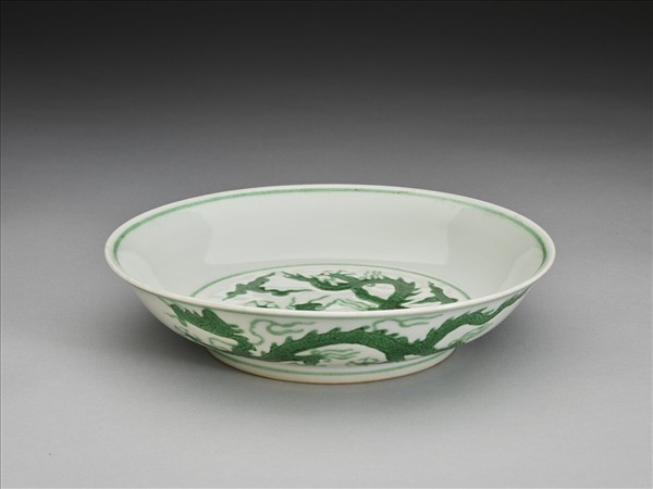 侈口,淺壁弧形,矮圈足。盤心與外壁刻畫雲龍三條,外壁隙地淺劃雙珠、波濤紋。薄胎白釉,龍紋加填綠彩,口足內外分畫綠線四道。底有青花書「大明正德年製」二行六字楷款,外加雙圈。