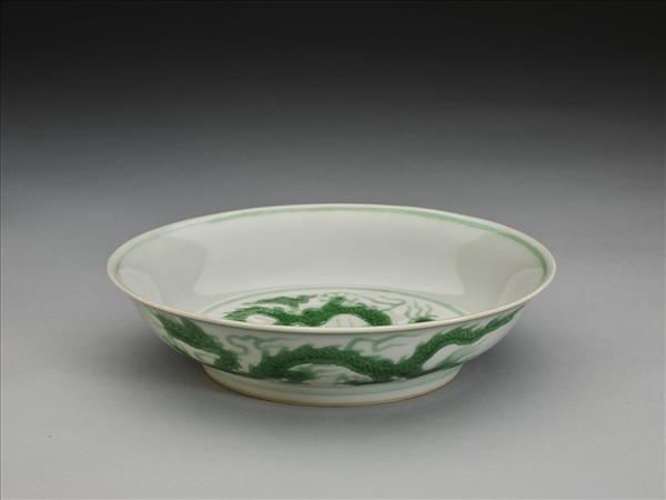 侈口,淺壁弧形,矮圈足。盤心與外壁刻畫雲龍三條,外壁隙地淺劃雙珠、波濤紋。薄胎白釉,龍紋加填綠彩,口足內外分畫綠線四道。底有青花書「大明正德年製」二行六字楷款,外加雙圈。