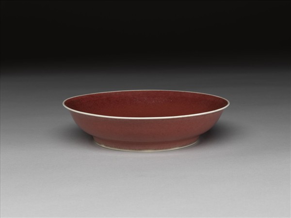 侈口窄唇,淺弧形壁,矮圈足。全器施霽紅釉,施釉至足邊,口沿與足邊各留一道白邊,足緣無釉露白胎。足內壁及底施白釉,底有「大明宣德年製」六字二行楷體暗款,外加雙圈。