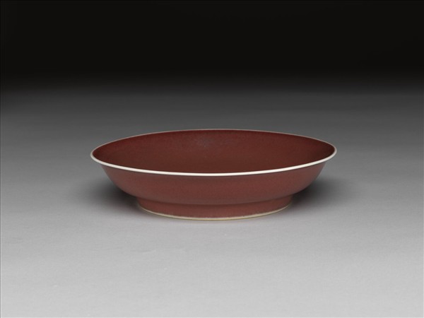 侈口窄唇,淺弧形壁,矮圈足。全器施霽紅釉,施釉至足邊,口沿與足邊各留一道白邊,足緣無釉露白胎。足內壁及底施白釉,底有「大明宣德年製」六字二行楷體暗款,外加雙圈。