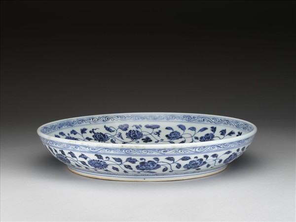 口微侈,淺弧壁、矮圈足。內壁畫菊、蓮、梔子、石榴、芍藥、芙蓉、茶花等十三朵,外壁則有類似花卉十四朵,盤心主紋把蓮一束。內壁口沿下飾卷草紋一周,上下青線六道。外壁口沿下畫卷草一周,底邊回紋,紋飾間加飾青線。