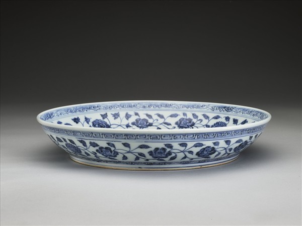 口微侈,淺弧壁、矮圈足。內壁畫菊、蓮、梔子、石榴、芍藥、芙蓉、茶花等十三朵,外壁則有類似花卉十四朵,盤心主紋把蓮一束。內壁口沿下飾卷草紋一周,上下青線六道。外壁口沿下畫卷草一周,底邊回紋,紋飾間加飾青線。