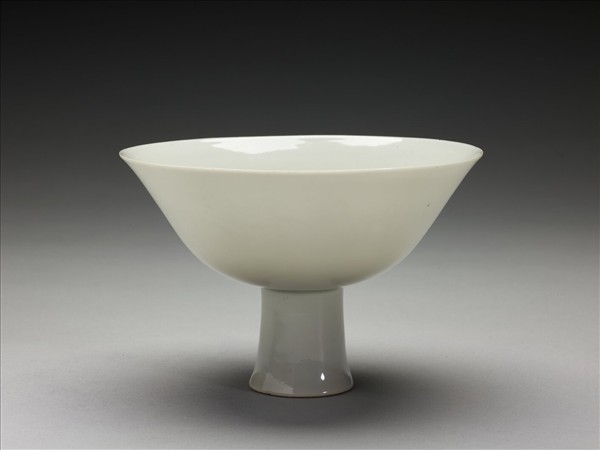 口部外侈、深壁、高圈足。胎質細膩潔白,碗壁薄,足壁較厚。全器施透明釉,圈足著地處露胎。器身內壁錐拱五龍紋,碗心刻有「永樂年製」雙行四字篆書款,款式外加花邊。在「致如來大寶法王書及賞單」中,可以看到在永樂六年(1408)正月初一時,永樂皇帝曾致贈給大寶法王五件帶五龍紋,四件帶雙龍的白瓷茶鐘,並配有紅油斜皮骰手。對照現藏於西藏的作品,其所致贈的茶鐘,應該就是類似眼前所見的五龍、雙龍高足杯。