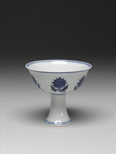 撇口,淺弧壁,高足外侈,平底。外壁畫折枝蓮花六朵,高足樸素無紋,內、外口沿、底邊、高足上下各加飾青線二道。青花濃艷鮮明,釉深處多帶褐色結晶疵斑。胎骨勻薄,足底露胎,潔白細膩。杯心青花書「大明宣德年製」二行六字楷款,外加雙圈。
