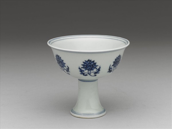 撇口,深弧壁,高足外侈,平底。外壁畫折枝番蓮六朵,口沿內外與足間加飾青線十道。足上及內面純白無紋飾。器內心有青花書「大明宣德年製」二行六字楷款,外加雙圈。