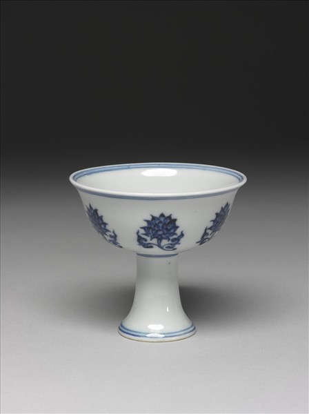 撇口,深弧壁,高足外侈,平底。外壁畫折枝番蓮六朵,口沿內外與足間加飾青線十道。足上及內面純白無紋飾。器內心有青花書「大明宣德年製」二行六字楷款,外加雙圈。