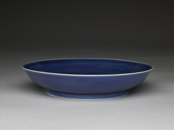 侈口窄唇,淺弧形壁,矮圈足。全器施霽青釉,施釉至足邊,口沿與足邊各留一道白邊,足緣無釉露白胎。足內壁及底施白釉,底有「大明萬曆年製」六字二行楷體暗款,外加雙圈。