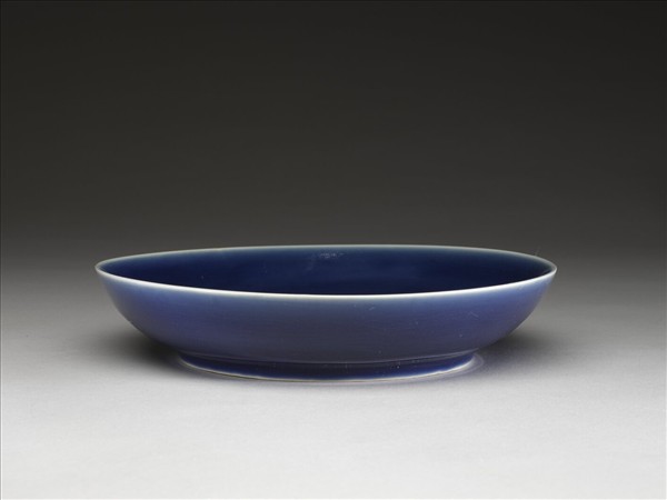 侈口窄唇,淺弧形壁,矮圈足。全器施霽青釉,施釉至足邊,口沿與足邊各留一道白邊,足緣無釉露白胎。足內壁及底施白釉,底有「大明萬曆年製」六字二行楷體暗款,外加雙圈。