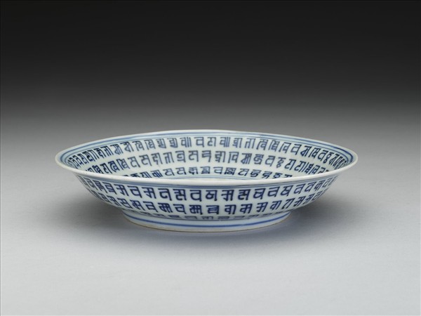 侈口,淺壁,矮圈足。盤心書一青花梵文,內外壁各書梵文三層,內外口沿及足邊加飾青線四道。底以青花書「大明萬曆年製」六字二行楷款,外加雙圈。盤心中央的梵文,藏語音譯為「朗久旺丹」,中文稱為「十相自在」,由七個梵文和三個符號組合而成。
