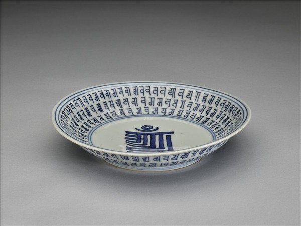 侈口,淺壁,矮圈足。盤心書一青花梵文,內外壁各書梵文三層,內外口沿及足邊加飾青線四道。底以青花書「大明萬曆年製」六字二行楷款,外加雙圈。盤心中央的梵文,藏語音譯為「朗久旺丹」,中文稱為「十相自在」,由七個梵文和三個符號組合而成。