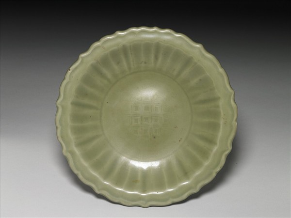龍泉窯 青瓷印花格文錦花口折沿盤