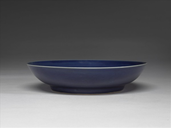 侈口,淺壁弧形,矮圈足。盤心及外壁淺劃雲龍三條。全器施霽青釉,施釉至足邊,口沿與足邊各留一道白邊,足緣無釉露白胎。足內壁及底施白釉,底有「大明萬曆年製」六字二行楷體暗款,外加雙圈。