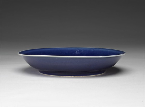 侈口,淺壁弧形,矮圈足。盤心及外壁淺劃雲龍三條。全器施霽青釉,施釉至足邊,口沿與足邊各留一道白邊,足緣無釉露白胎。足內壁及底施白釉,底有「大明萬曆年製」六字二行楷體暗款,外加雙圈。