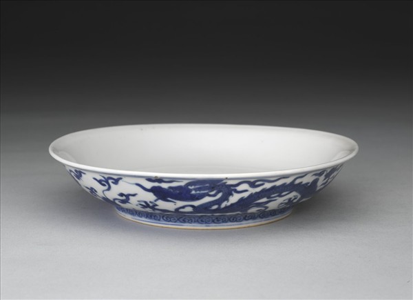 侈口窄唇,淺壁,矮圈足。薄胎白釉,外壁畫青龍二條,加飾纏枝番蓮花,足邊畫如意雲一周,口足分飾青線六道。內面純白,樸素無紋飾。底有青花書「大明萬曆年製」二行六字楷款,外加雙圈。