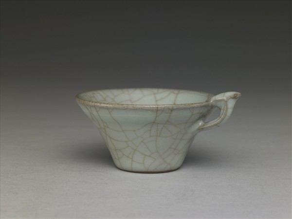 敞口,斜直壁,漏斗形杯身一側按置一個把手,平底內挖出一圈臥足。墊燒,內外施青釉,顏色青中帶灰。釉面有棕色紋片,口沿釉薄處現出灰棕色邊,口下一圈積釉,足端無釉加塗赭汁,局部有刮痕,顯露出深灰色的胎體。對照江蘇省金壇堯塘西榭村、安徽省合肥市元代窖藏(1333)的出土品,而可追溯出臨仿的原型,以及原來或搭配承盤成套使用。相似的青瓷作例,亦見於安徽省安慶市雙井街89號元代窖藏。由於該窖藏同時共伴出土元青花盤和匜,故可反過來說明此品燒製於元朝。不僅如此,造型相同的單把杯也有龍泉窯青瓷、景德鎮霽青釉、青白釉,以及杭州市窖藏和北京故宮收藏產地猶待確認的白瓷等作品,明顯地反映出單把杯流行於元朝。