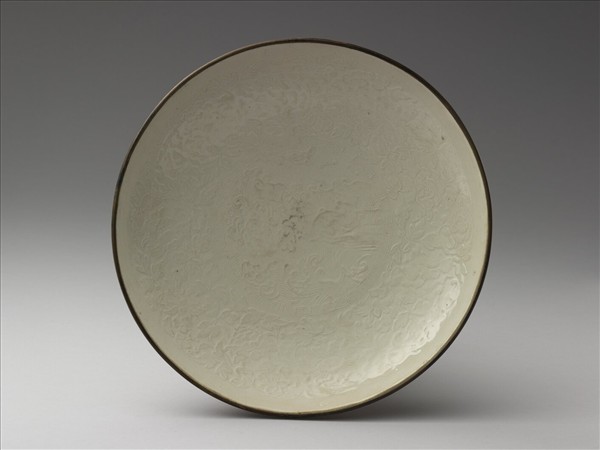 定窯 白瓷印花牡丹犀牛望月圖盤