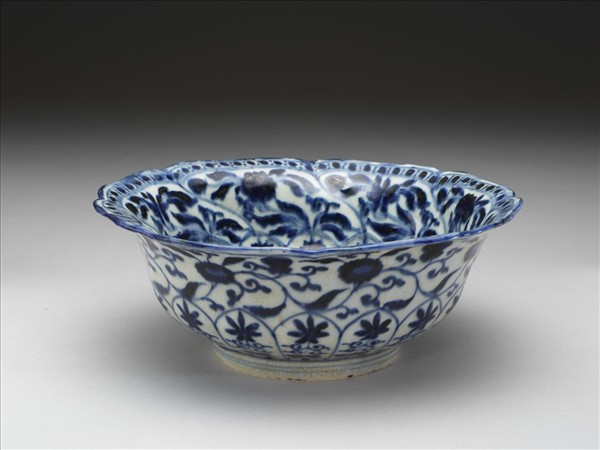 碗為八瓣花口,窄折沿,弧形深壁造型。內外滿飾白底藍花圖案,口沿一圈圈點紋,內周壁上繞纏枝花卉,下接十六個花瓣形長格,內置折枝花,底心為八瓣錦地花卉,外圍一圈藍地白點。碗外周壁上繪纏枝菊花,下部近底處則排佈十六格折枝花圖案,底接圈足,足端無釉露胎,足內釉面顏色微泛黃。此品內外所見呈放射狀外放之規整折枝花及底心錦地圖案,因與碗礁一號沈船出土之「青花雛菊紋菱花盤」具有類似的佈局與美感趣味,故可透過該船沉沒於一六九○年左右,反推此品可能的生產時間。另外,與碗礁一號出土品類似的瓷盤,本院亦有典藏。(引自《亞洲探險記:十七世紀東西交流傳奇》)