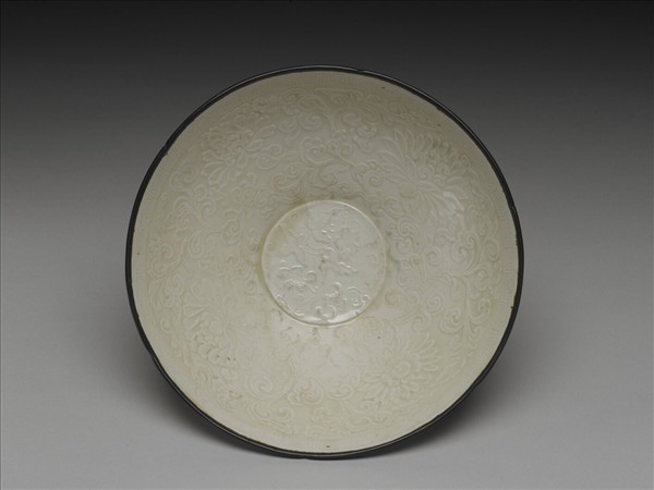 六瓣葵花口碗,敞口,深弧壁,圓底,矮圈足。口鑲銅稜釦。器內以印花為飾,滿印牡丹、菊等數種圖案式纏枝花卉,花形飽滿多姿,枝蔓長葉卷繞如雲湧,充滿裝飾趣味。口邊印回紋一周。原附黃簽,墨書:「二等無款定窯銅鑲口拱花鐃碗一件」。