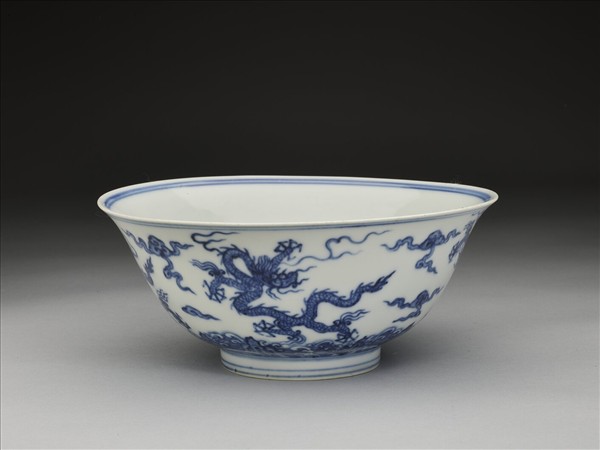 侈口窄唇,深壁,圈足。碗外壁青花畫四蛟龍,間飾三出、朵雲紋,底邊飾波濤、山石一周。內壁素白無紋,碗心畫一雲龍。內外共飾青線十道。底青花書「大明成化年製」雙圈六字楷款。