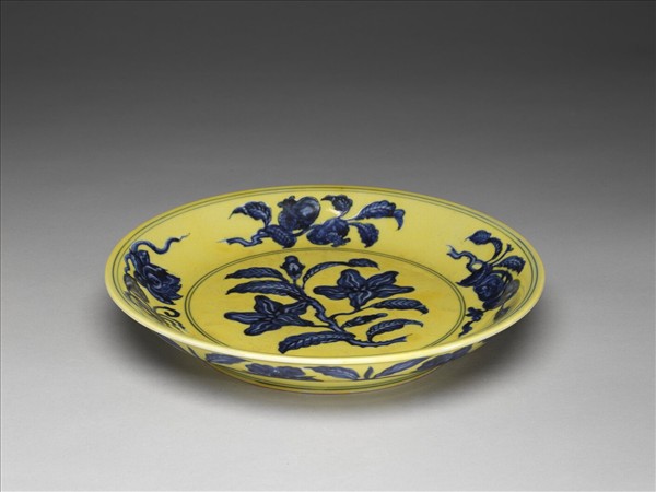 侈口窄唇,淺壁,矮圈足。內壁畫青花石榴、葡萄等四種果實,盤心畫玉蘭一枝。外壁畫轉枝牡丹花七朵。內外分畫青線十道。原為白地青花,加施黃釉一層。底有青花書「大明弘治年製」二行六字楷款,外加雙圈。