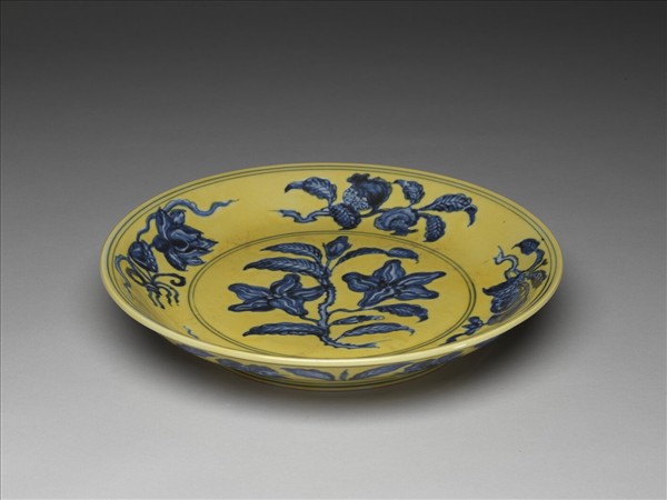 侈口窄唇,淺壁,矮圈足。內壁畫青花石榴、葡萄等四種果實,盤心畫玉蘭一枝。外壁畫轉枝牡丹花七朵。內外分畫青線十道。原為白地青花,加施黃釉一層。底有青花書「大明弘治年製」二行六字楷款,外加雙圈。