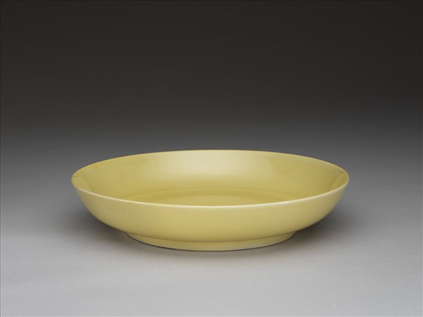 侈口,淺壁弧形,矮圈足。胎質較薄,內外滿施嬌黃釉,盤底純白,樸素無紋飾。底均有青花書「大明弘治年製」六楷字款,外加雙圈。