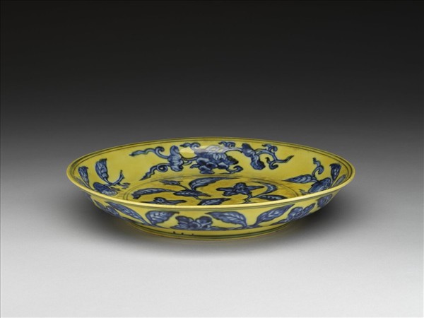 侈口窄唇,淺壁,矮圈足。內壁畫青花石榴、葡萄等四種果實,盤心畫玉蘭一枝。外壁畫轉枝牡丹花八朵。內外分畫青線十道。原為白地青花,加施黃釉一層。底有青花書「大明正德年製」二行六字楷款,外加雙圈。