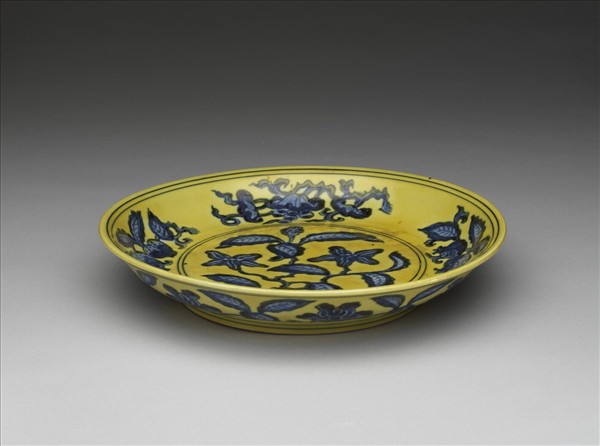 侈口窄唇,淺壁,矮圈足。內壁畫青花石榴、葡萄等四種果實,盤心畫玉蘭一枝。外壁畫轉枝牡丹花八朵。內外分畫青線十道。原為白地青花,加施黃釉一層。底有青花書「大明正德年製」二行六字楷款,外加雙圈。