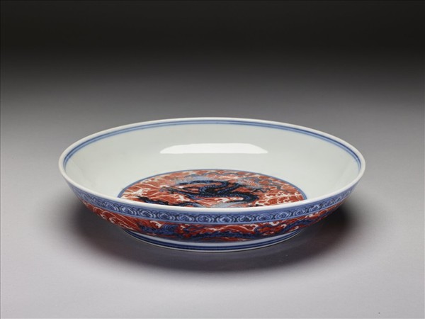 青花紅彩波濤龍紋盤