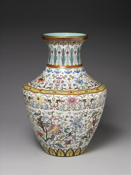 敞口寬邊,短頸,斜肩,碩腹向下斂收,淺圈足。胎質厚重,器表施白釉,釉面以各色粉彩描繪蕉葉、纏枝番蓮花、四季花卉及靈芝。局部圖案加描金線,器內及底皆施湖綠色釉,底心以青花書「大清乾隆年製」六字篆款。就裝飾風格而言,此件作品充分展現出乾隆官窯特有的繁花似錦的風格,器表畫滿各式寫實的和圖案化的花卉,即使蕉葉、蓮瓣及肩部的隔線之內,亦再加飾朵花及圓圈的圖案。尤有甚者,每一個圖案的細節又極其精工考究,絕不因紋樣繁複、細瑣而草率了事,展現出在一個以技術為導向的時代,平面瓷繪亦以精工妙筆為能事。