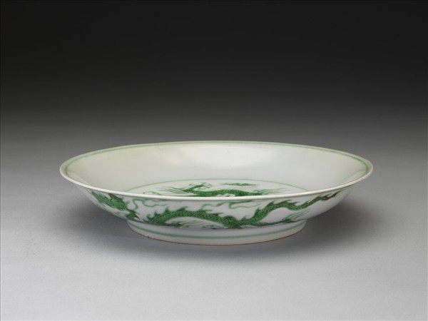 侈口,淺壁弧形,矮圈足。盤心與外壁刻畫雲龍三條,外壁隙地淺劃雙珠、波濤紋。薄胎白釉,龍紋加填綠彩,口足內外分畫綠線四道。底有青花書「大明正德年製」二行六字楷款,外加雙圈。