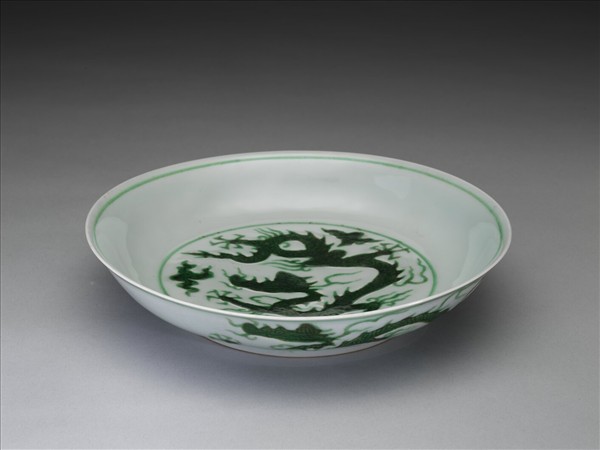 侈口窄唇,淺壁,矮圈足。盤心與外壁刻畫雲龍三條,外壁隙地淺劃波濤紋。薄胎白釉,龍紋加填綠彩,口足內外分畫綠線四道。底有青花書「大明正德年製」二行六字楷款,外加雙圈。