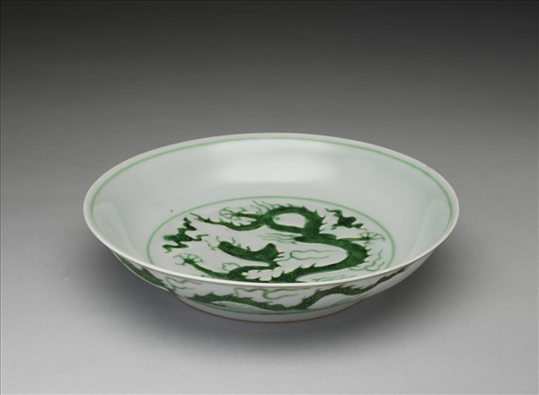 侈口窄唇,淺壁,矮圈足。盤心與外壁刻畫雲龍三條,外壁隙地淺劃波濤紋。薄胎白釉,龍紋加填綠彩,口足內外分畫綠線四道。底有青花書「大明正德年製」二行六字楷款,外加雙圈。