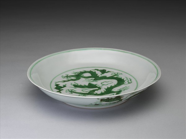 侈口窄唇,淺壁,矮圈足。盤心與外壁刻畫雲龍三條,外壁隙地淺劃波濤紋。薄胎白釉,龍紋加填綠彩,口足內外分畫綠線四道。底有青花書「大明正德年製」二行六字楷款,外加雙圈。