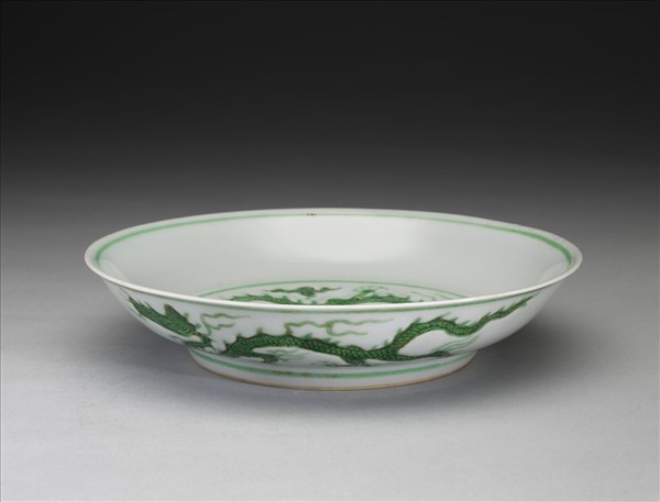 侈口窄唇,淺壁,矮圈足。盤心與外壁刻畫雲龍三條,外壁隙地淺劃波濤紋。薄胎白釉,龍紋加填綠彩,口足內外分畫綠線四道。底有青花書「大明正德年製」二行六字楷款,外加雙圈。