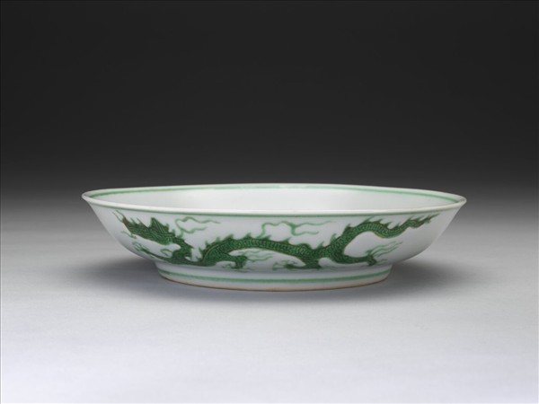 侈口窄唇,淺壁,矮圈足。盤心與外壁刻畫雲龍三條,外壁隙地淺劃波濤紋。薄胎白釉,龍紋加填綠彩,口足內外分畫綠線四道。底有青花書「大明正德年製」二行六字楷款,外加雙圈。