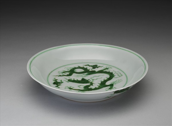 侈口窄唇,淺壁,矮圈足。盤心與外壁刻畫雲龍三條,外壁隙地淺劃波濤紋。薄胎白釉,龍紋加填綠彩,口足內外分畫綠線四道。底有青花書「大明正德年製」二行六字楷款,外加雙圈。