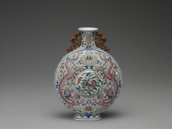 粉彩花卉雙龍紋扁壺