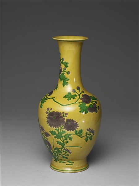 瓶,侈口窄唇,長頸,豐肩,斂腹下收至足處外撇,矮圈足。薄胎骨,施罩嬌黃釉為地,足底緣不上釉,露出白色胎骨,器外壁面淺刻芙蓉及菊花以紫彩裝飾,加飾綠彩的折枝葉脈及湖石、野草,器頸及腹部有粉彩蝶三隻,口沿及底邊近足處,各畫飾一道綠彩。