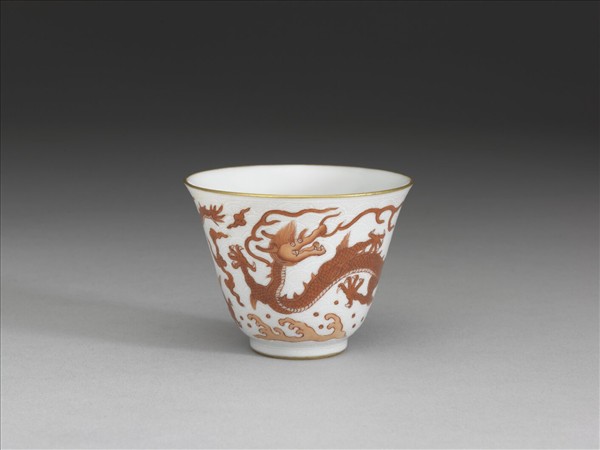 杯,口略撇,口緣描金一圈,深壁下斂,圈足。胎壁薄,外壁胎體細緻印海水紋地,並以釉上紅彩繪雙雲龍,近底部飾水紋一圈。足緣繪金彩,底外紅料書「大清乾隆年製」雙行六字雙方框楷款。